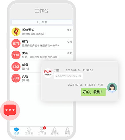 搭建企業(yè)內(nèi)外部即時(shí)交流溝通平臺(tái),也是PLM系統(tǒng)消息通知平臺(tái);通訊錄成員間可單聊、群聊,支持文字、語(yǔ)音、貼圖表情、圖片、視頻、文件等各種消息類(lèi)型 。